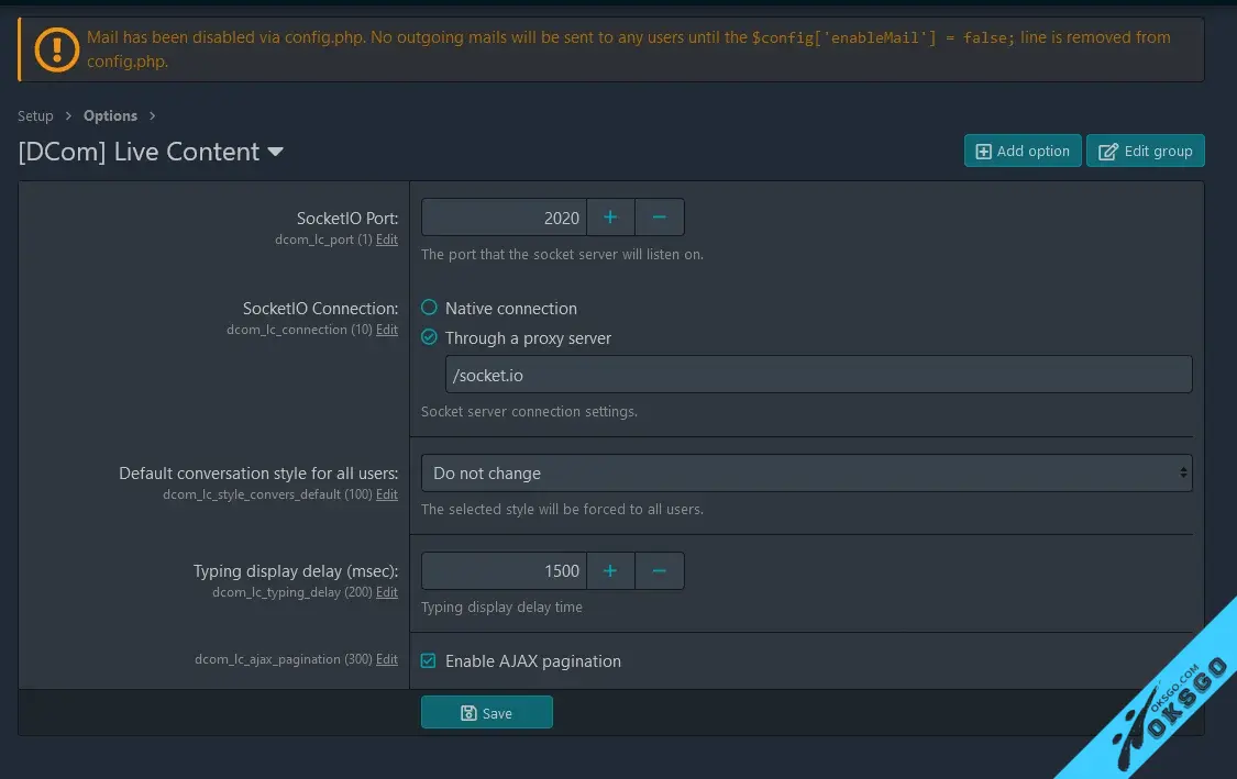 添加使用 WebSocket 的实时论坛对话。[MMO] 必须安装 Centrifugo才能运行此插件。您可以为需要实时对话的群组设置权限。